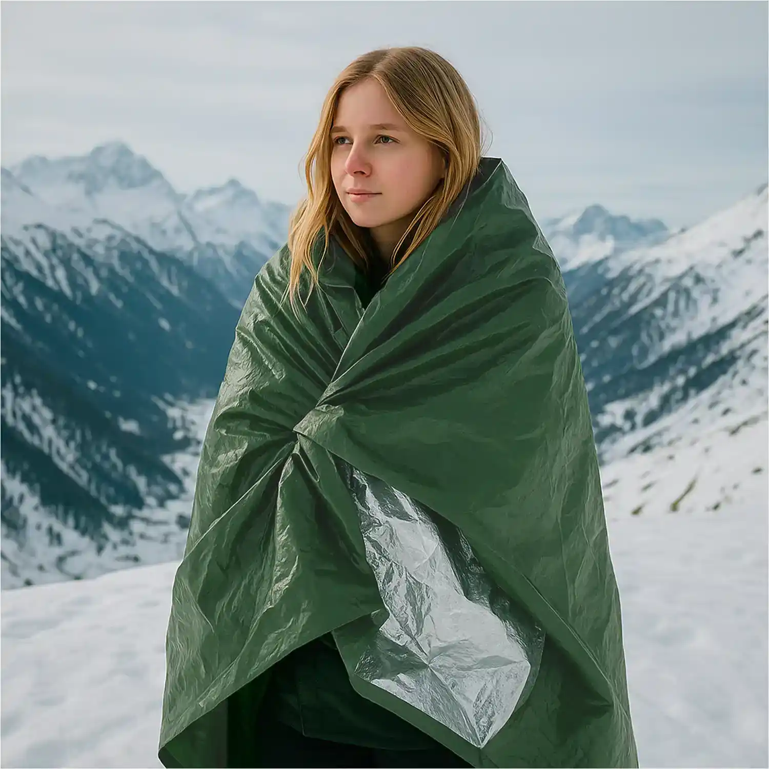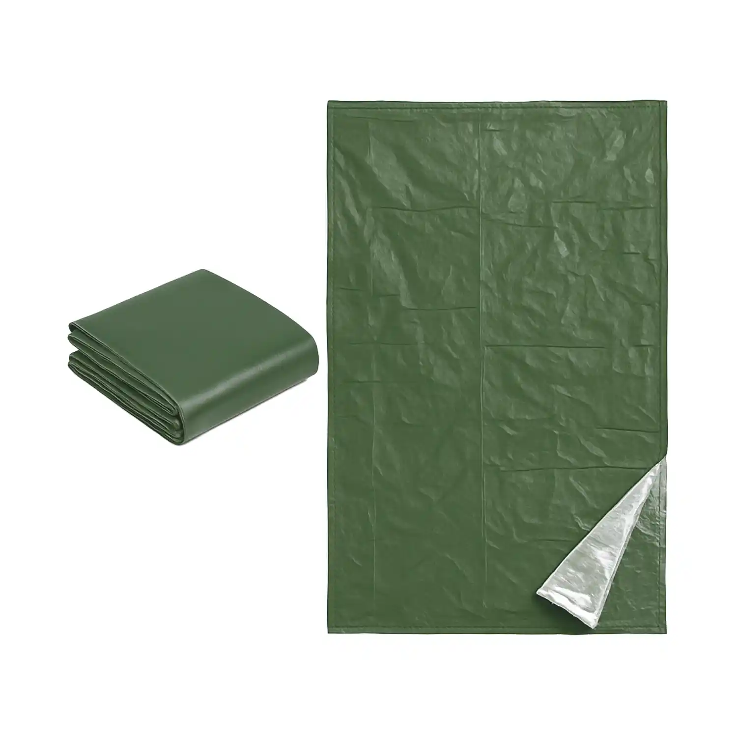 One side features a vibrant color for visibility or camouflage, while the silver side reflects up to 90% of body heat, helping retain warmth and prevent hypothermia. It’s 100% waterproof, windproof, and resistant to tears and punctures, making it ideal for emergencies, camping, hiking, or roadside situations.