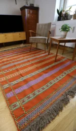 Whether used as a rug, wall hanging, or throw, each kilim reflects the quiet strength and artistic depth of the region’s history and craftsmanship. Its balanced design and natural wool texture bring character, comfort, and authenticity into any room.